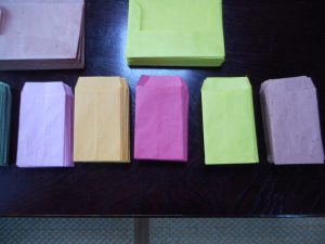 封筒は11色、ポチ袋は10色です。色を組み合わせ後から袋に入れます。