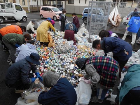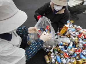 集まった大量の空缶です。中にはスチール缶も混ざっているので分別が必要です。