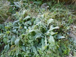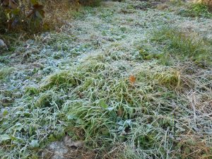 11月に入り朝夕の冷え込みが厳しく、今朝は本格的な霜が降りました。車のガラスや周辺の草にも霜が降り、一面真っ白になりました。寛ちゃんハウス入口のモミジの木も一段と紅葉が進みました。
